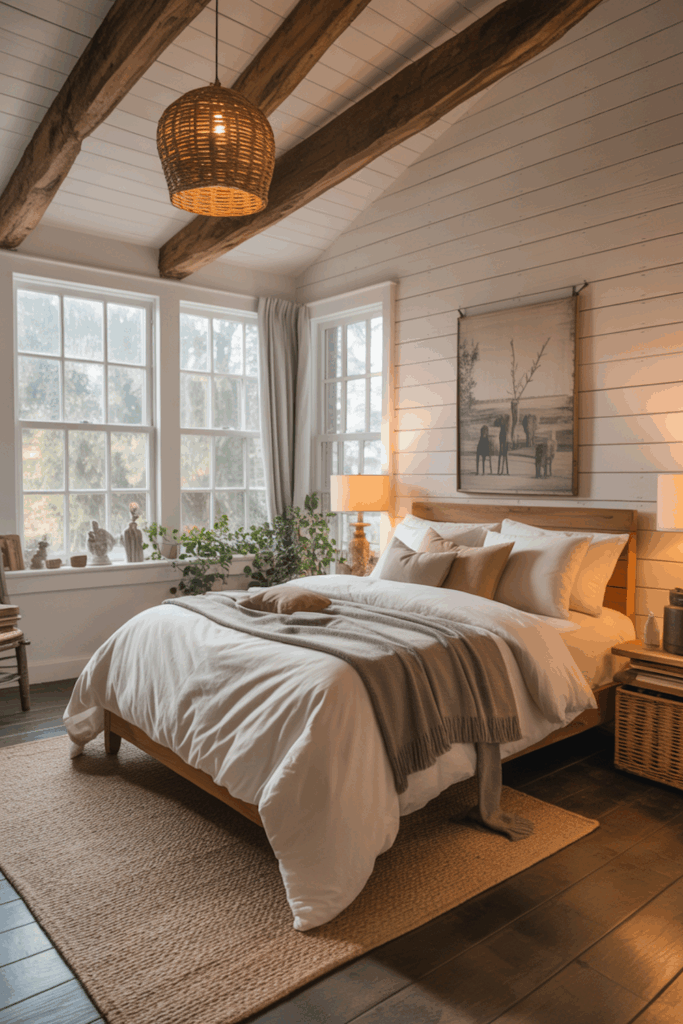 Rustic bedroom ideas bring warmth, comfort, and natural charm into your personal retreat. Using elements like reclaimed wood furniture, exposed beams, and earthy textures, you can create a cozy, inviting space that feels timeless and relaxed. Soft linens, neutral tones, and layered textiles add depth and comfort, making the room both stylish and welcoming. Rustic lighting fixtures, from wrought iron chandeliers to vintage lamps, complete the look with a subtle touch of character.
