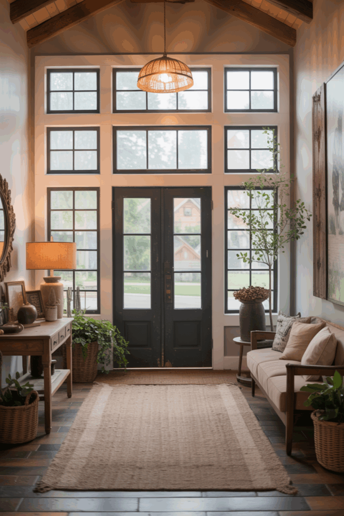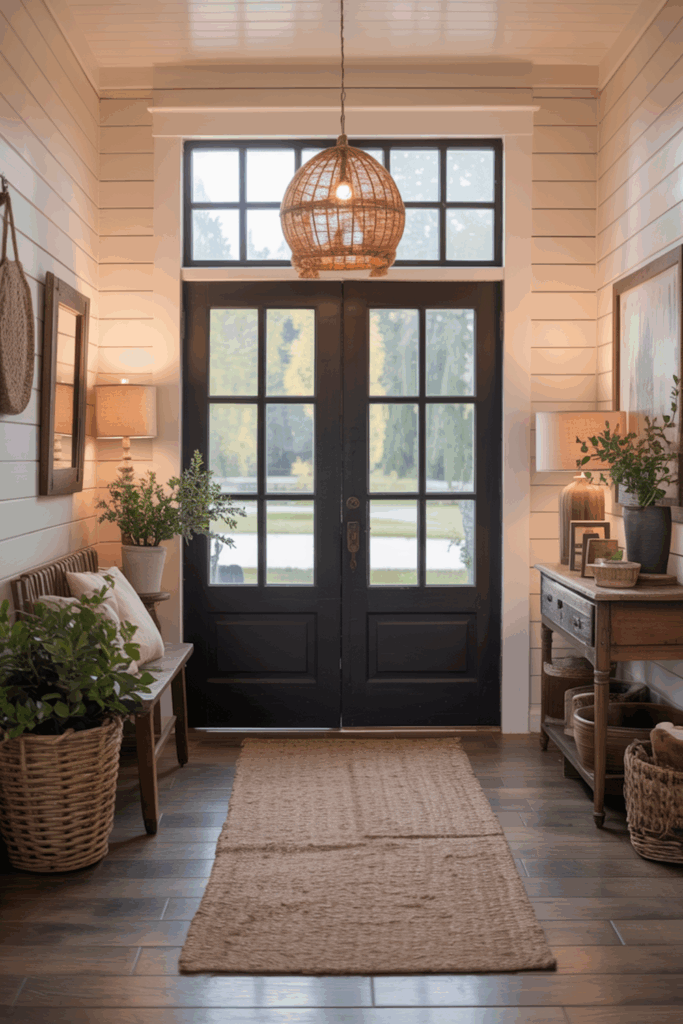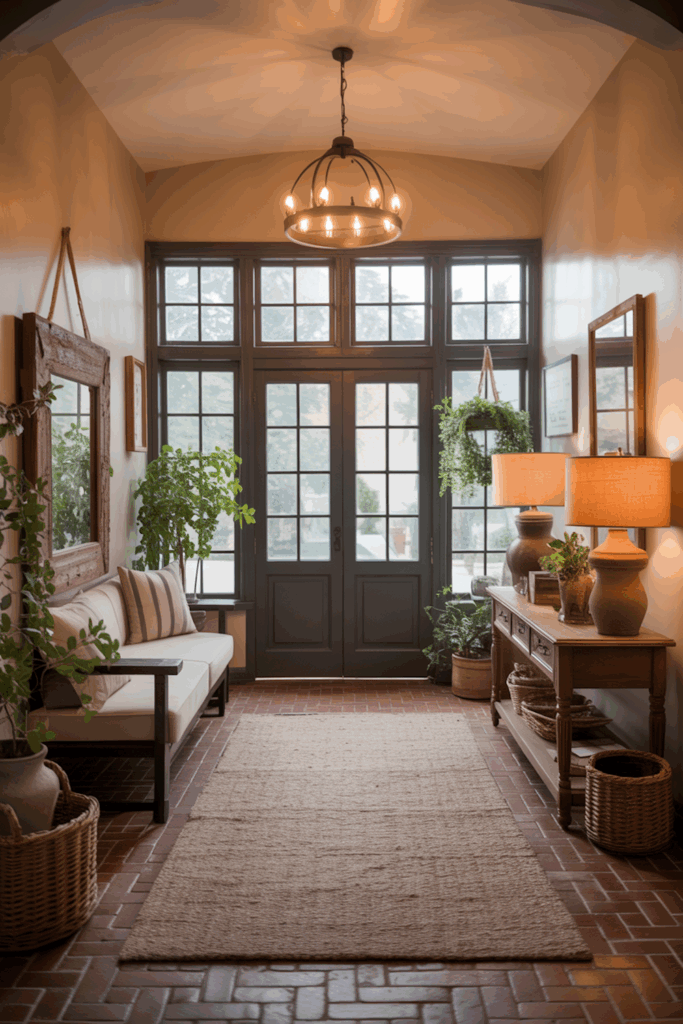 A wooden console table paired with vintage-inspired décor or a distressed mirror instantly adds charm, while neutral rugs and textured runners provide comfort and grounding as guests enter your home. Adding soft lighting with lantern-style fixtures or Edison bulbs enhances the cozy, rustic feel.