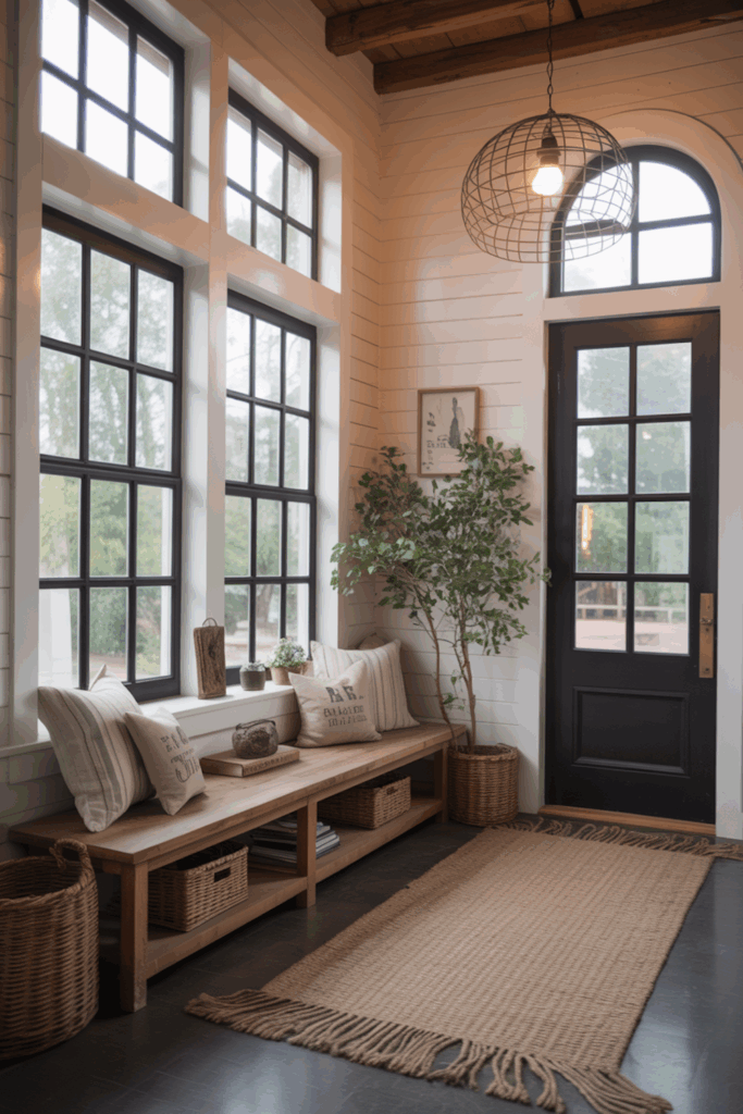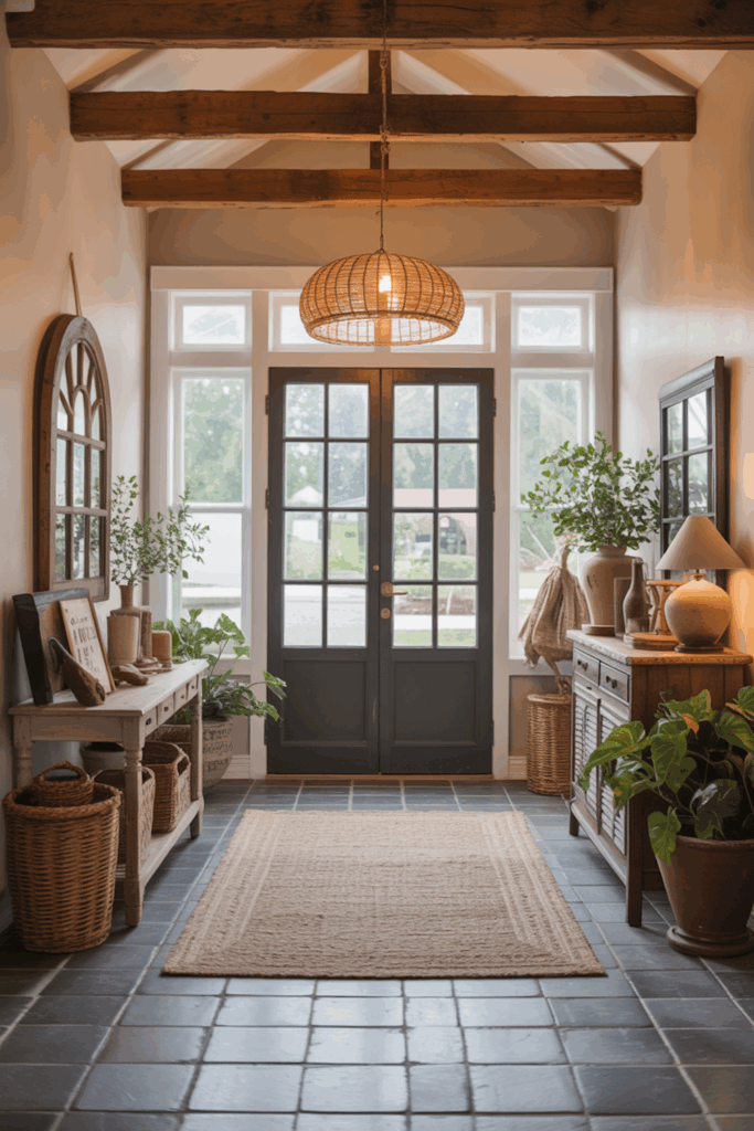 Incorporating functional rustic elements makes the entryway both beautiful and practical. Hooks made from reclaimed wood or wrought iron, storage benches, and baskets help keep shoes, bags, and everyday essentials organized while still maintaining a stylish, farmhouse-inspired aesthetic.