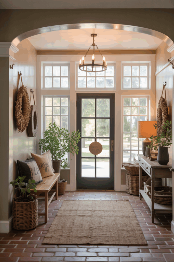 Functional rustic décor makes a foyer both beautiful and practical. Hooks made from reclaimed wood or black iron are perfect for coats and bags, while storage benches or baskets keep shoes, umbrellas, and everyday essentials organized yet stylish. Seasonal touches elevate the rustic charm, like a simple greenery arrangement for spring, autumnal pumpkins, or a classic wreath on the front door.