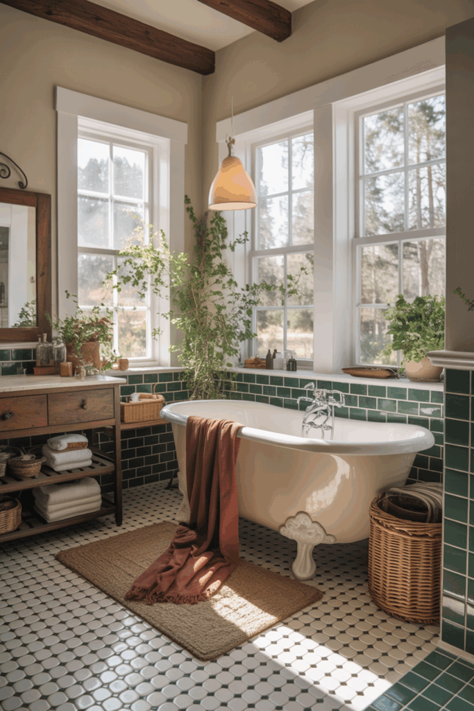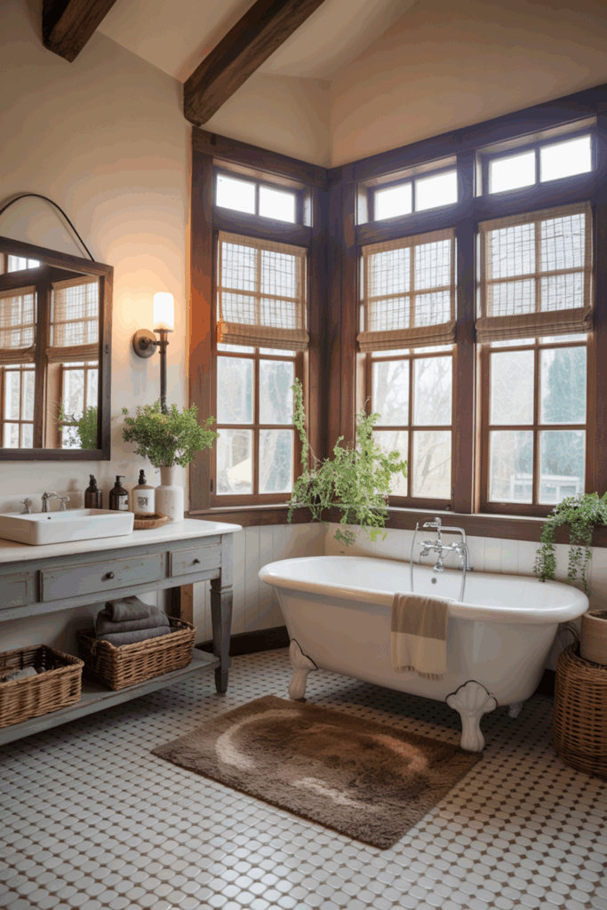 Rustic bathroom ideas focus on creating a warm, inviting space that feels natural and timeless. Using elements like reclaimed wood vanities, stone or brick accents, and earthy color palettes, you can craft a bathroom that exudes charm and character. Soft, neutral tones like beige, taupe, and warm gray paired with textured towels and rugs add comfort and depth, making the space feel cozy and serene. Rustic lighting fixtures, such as wrought iron sconces or vintage-style pendants, complete the look while providing soft, ambient light.