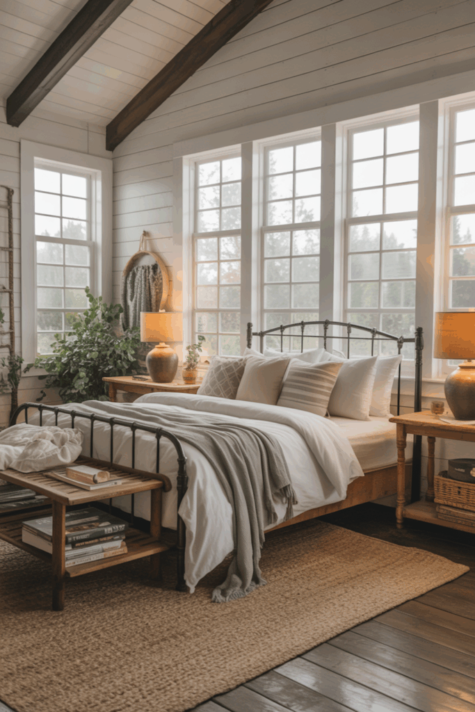 Lighting plays a big role in achieving a rustic aesthetic. Consider vintage-inspired lamps, wrought iron chandeliers, or Edison bulb fixtures that create a soft, cozy glow. Decorative touches like woven baskets, antique mirrors, handmade pottery, or greenery further enhance the natural, lived-in vibe. Even small details, like linen curtains, wooden picture frames, or rustic wall art, contribute to a space that feels both stylish and personal. Rustic bedroom ideas are versatile, too—you can blend farmhouse elements, cabin-inspired décor, or even modern accents to create a unique retreat that reflects your personality while remaining cozy, welcoming, and timeless.