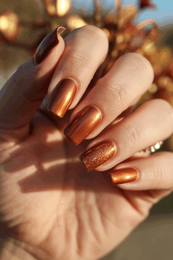This look blends copper shimmer with a soft gradient effect. The glitter starts dense at the tips and fades toward the base.