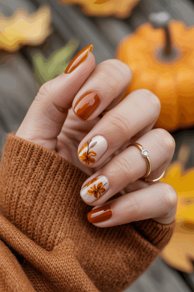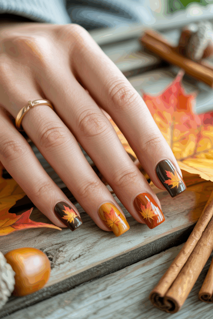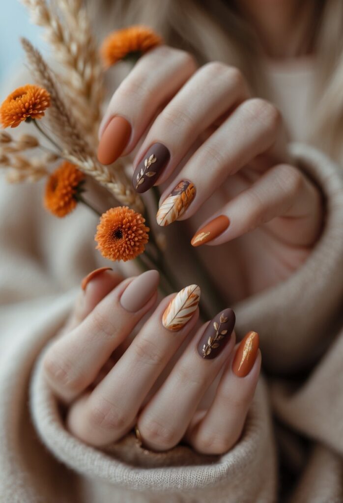 Abstract swirls use warm tones like ochre, brown, and burnt orange to create a cozy fall look. These designs blend colors softly, making each nail unique. The style suits those who want a modern and artistic manicure that fits the September season. Perfect for fall fashion, this nail art pairs beautifully with neutral outfits, cozy knits, and seasonal accessories, offering a trendy yet creative look that stands out while still embracing autumn’s earthy color palette.