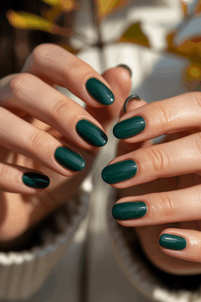Dark teal nails with a shiny finish create a polished, elegant look. The glossy surface highlights the deep blue-green color, adding depth and brightness. This style works well for both casual and formal occasions. It pairs nicely with simple or detailed nail art.