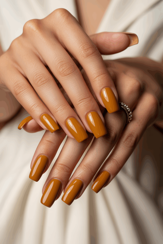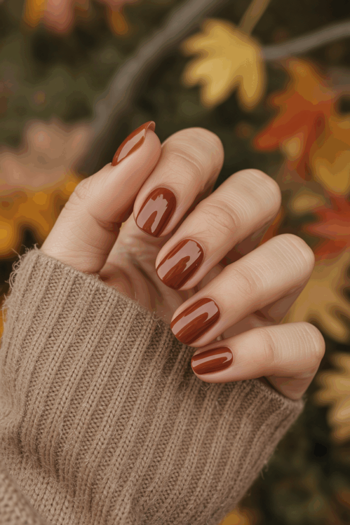Glossy sepia tones offer a warm, rich look for September nails. These shades blend brown and soft reddish hues, creating a polished and natural feel.