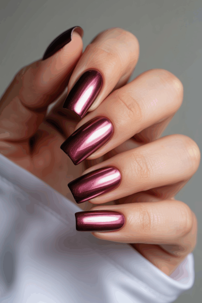 This style uses a deep berry color with a chrome finish. The nails show a subtle shift that gleams blue under light. It fits well with both late summer and early fall looks. The effect adds a modern and sleek touch without being too flashy.