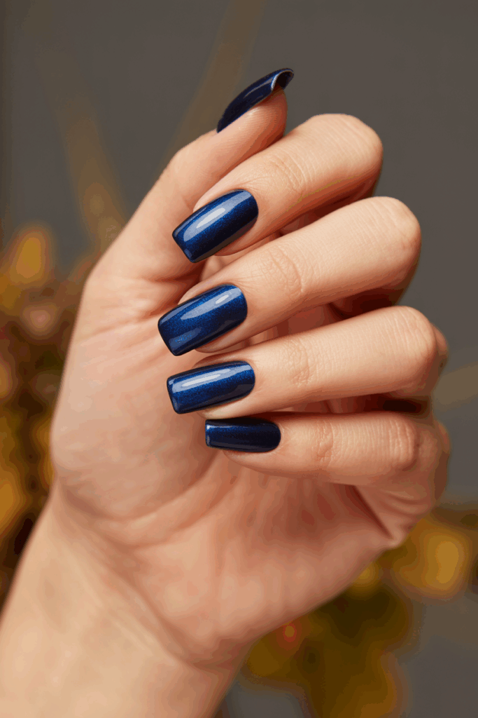 Night sky blue chrome nails mix deep blue with a shiny, metallic finish. This look captures the calm and mystery of the night sky.