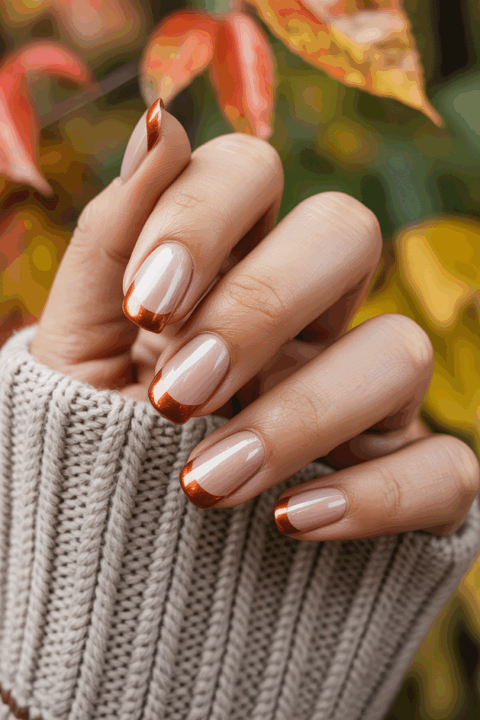 Metallic copper tips add a warm, rich look to any manicure. They offer a sleek contrast, especially against neutral or matte bases. This style is simple but stylish, perfect for the September season. It pairs well with gold or bronze accents for extra shine, making it a versatile choice for both everyday wear and special events. Copper French tips bring a modern twist to a classic design, adding autumn warmth that complements cozy outfits, seasonal colors, and elegant fall nail trends.