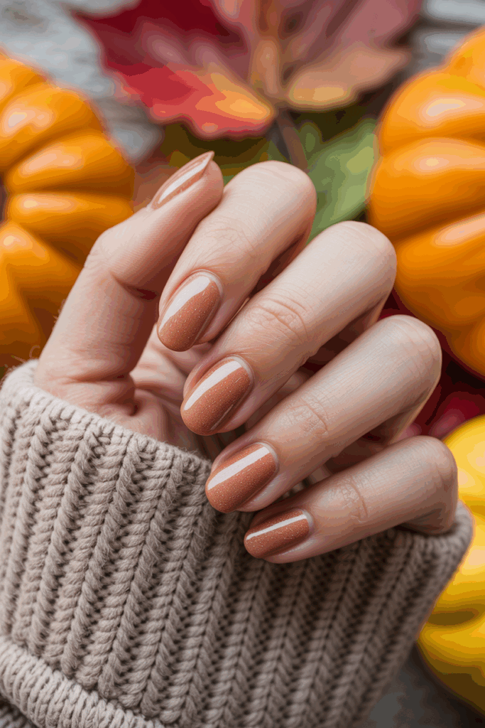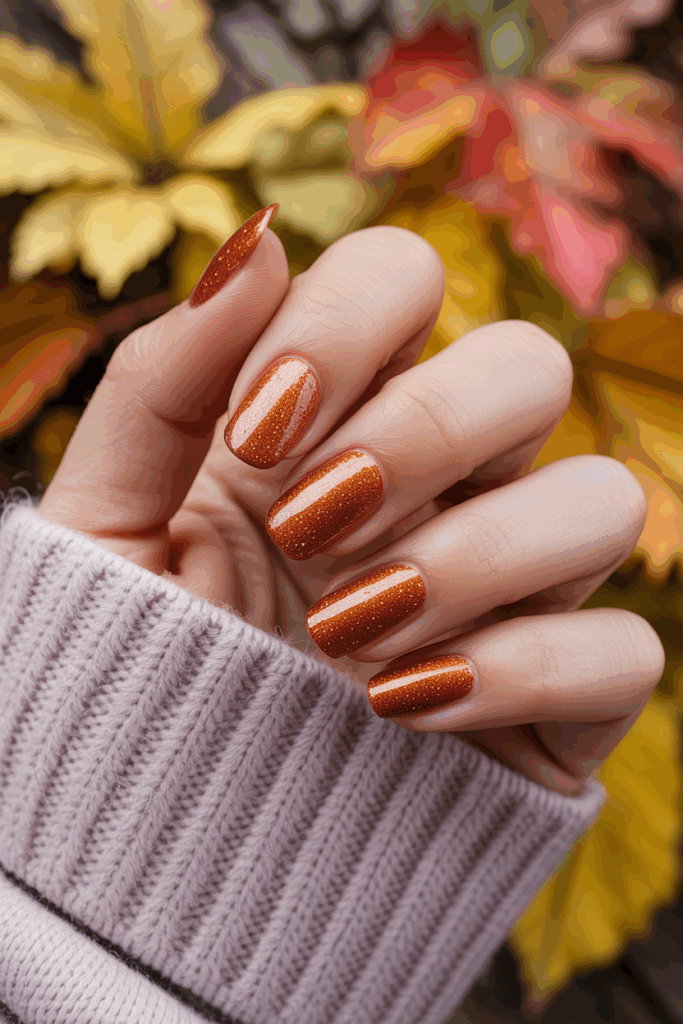 Shimmery burnt sienna nails bring a warm, earthy tone with a subtle shine. The color fits well with fall’s natural hues and adds a modern touch. It works as a flawless base or paired with gold accents for a refined, seasonal look.