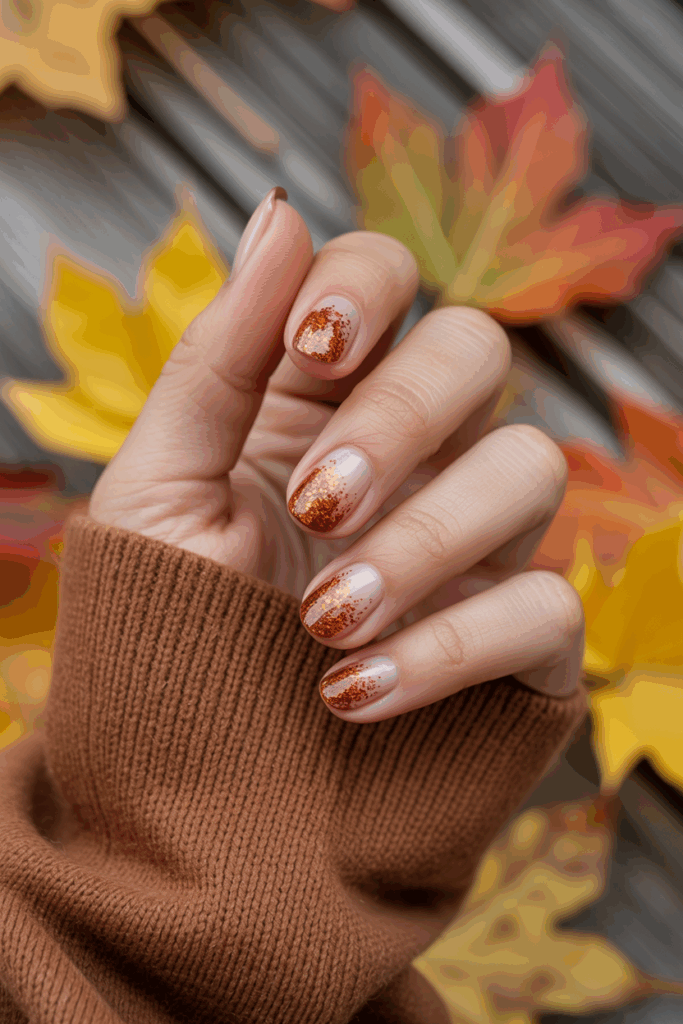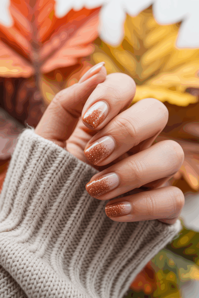 Copper glitter ombré nails blend warm copper tones with a gradual sparkle, creating a soft, elegant gradient that feels perfect for autumn.