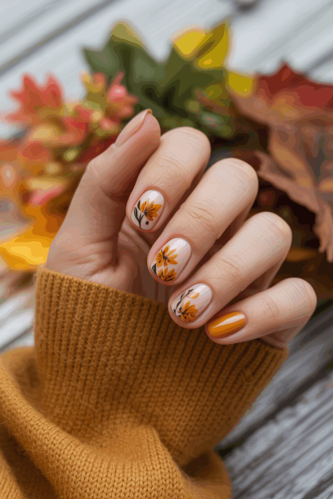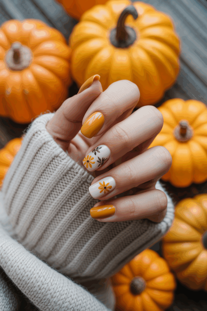 Marigold floral designs bring a bright, warm touch to nails. They often use deep yellow and orange tones that fit well with September’s fall vibe. This style is simple but eye-catching, making it a popular choice for seasonal nail art.