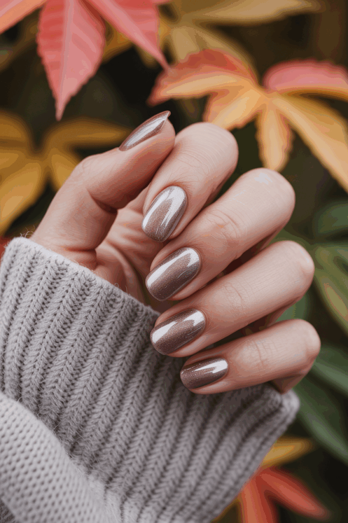 This finish works well for fall, offering a unique twist on traditional chrome nails. It suits both casual and formal styles.