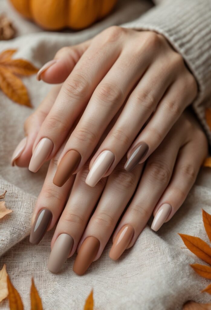 This earthy-inspired color scheme is perfect for those who love a minimalist vibe with a seasonal twist. Neutral nails pair easily with any outfit, making them a go-to for September through November and beyond. Whether you’re heading to work, a fall wedding, or a weekend pumpkin patch trip, earthy tones provide a calm, grounded aesthetic that captures autumn’s natural beauty. These nails are understated yet chic, giving your look a sophisticated edge while staying true to fall’s cozy, rustic charm.