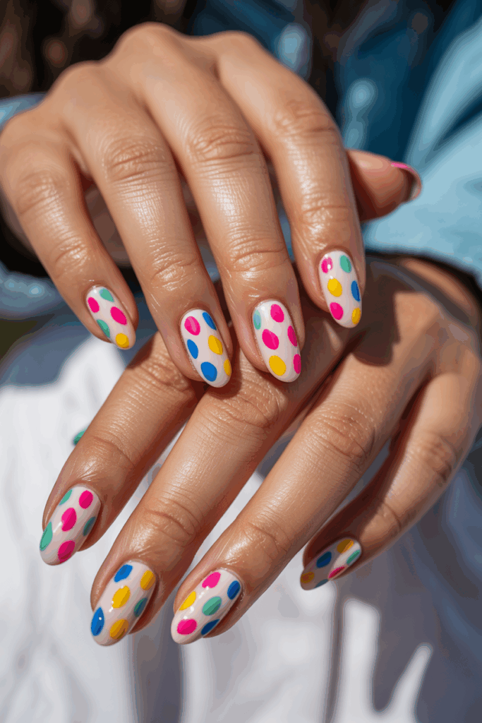 The size and color of dots can vary widely, allowing for subtle elegance or bright, eye-catching contrast. Small white dots on a soft base create a delicate effect, while colorful or neon dots add a fun, lively vibe.