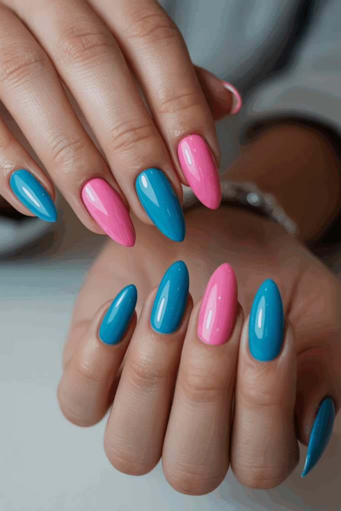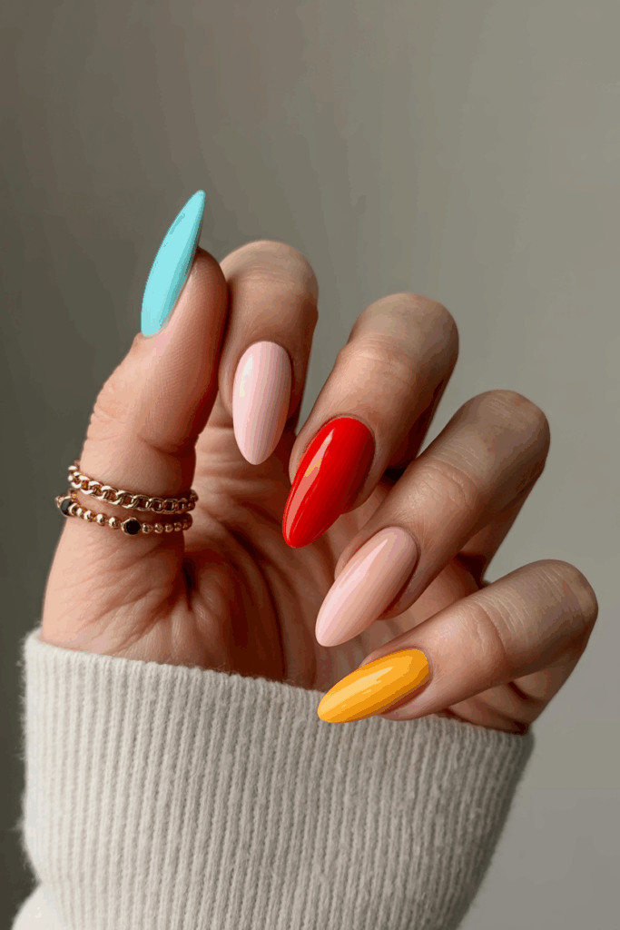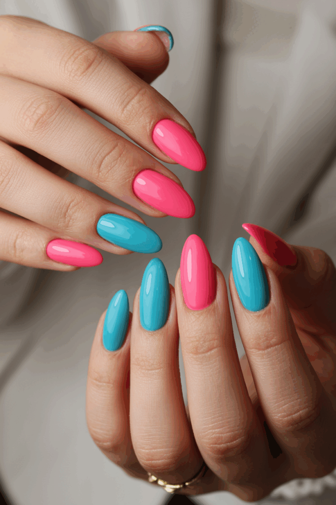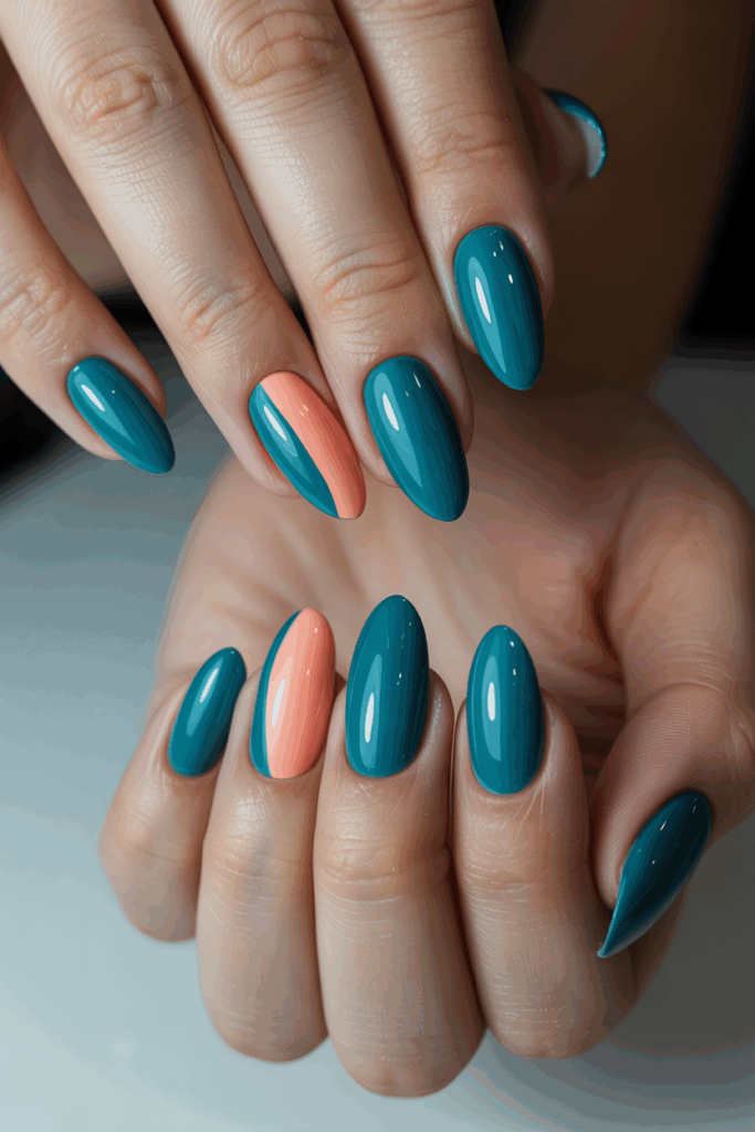 Teal brings a sense of calm and sophistication, while coral introduces a fresh, energetic vibe. Together, they work well on short almond nails by emphasizing the shape and length subtly.