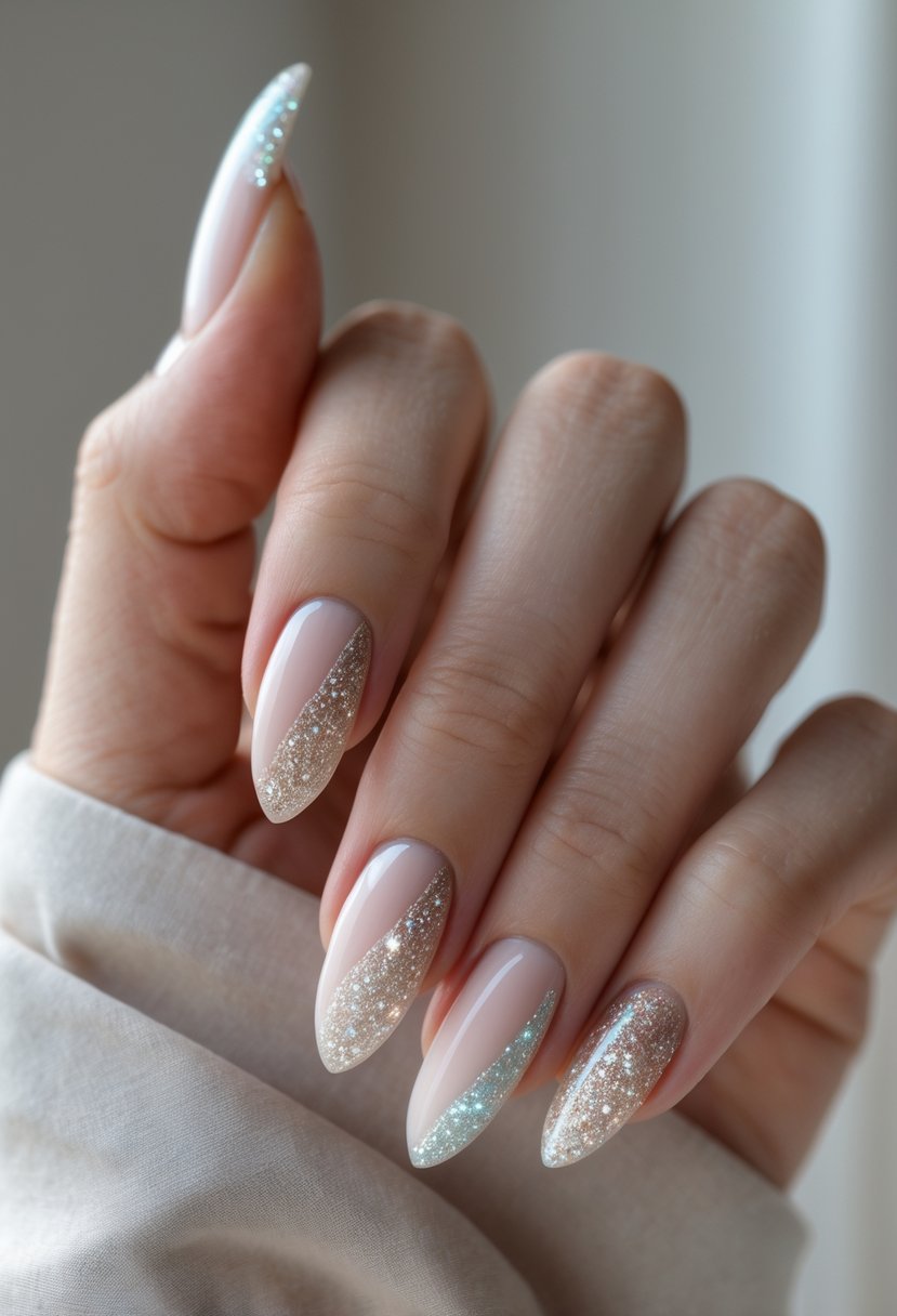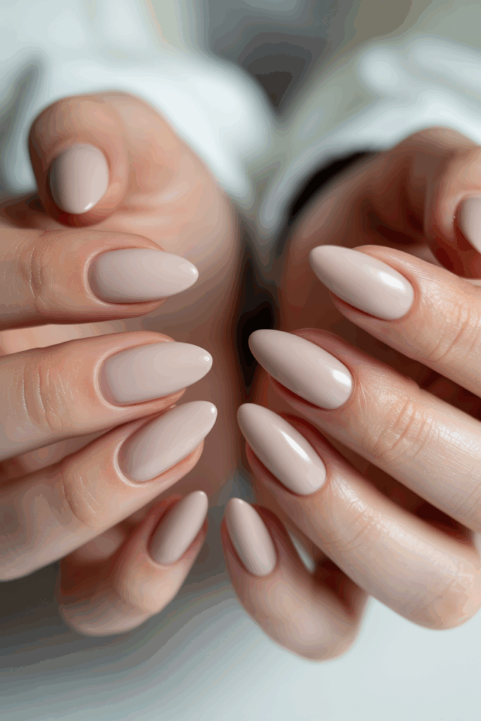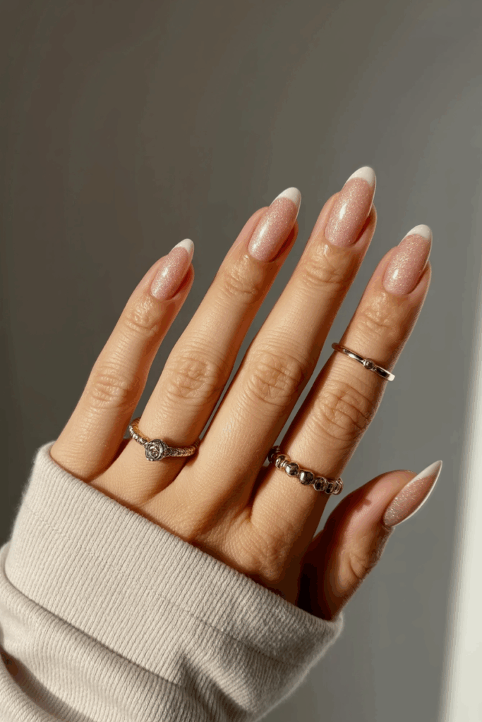 Pearl or fine glitter accents add just the right amount of texture and light, enhancing the almond shape subtly. It suits both casual and formal settings due to its understated elegance.