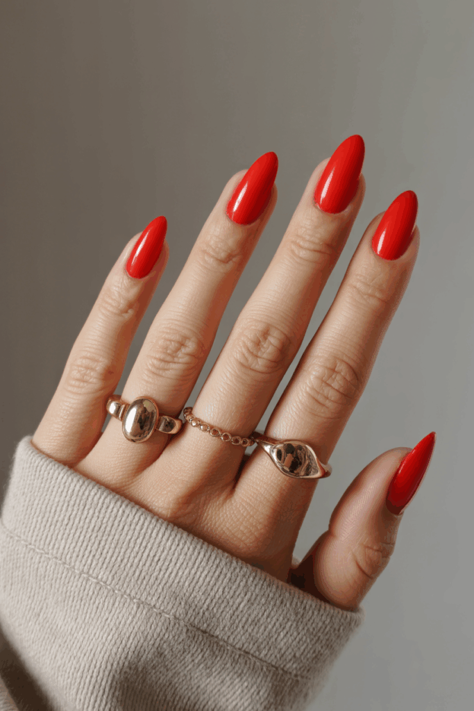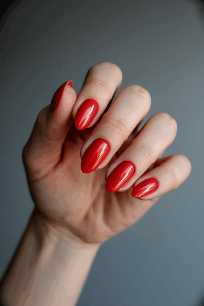 Short almond nails painted in bold red create a strong and confident look. This style works well for both casual and formal settings. The red color pairs with many outfits and adds a classic touch without being too flashy.