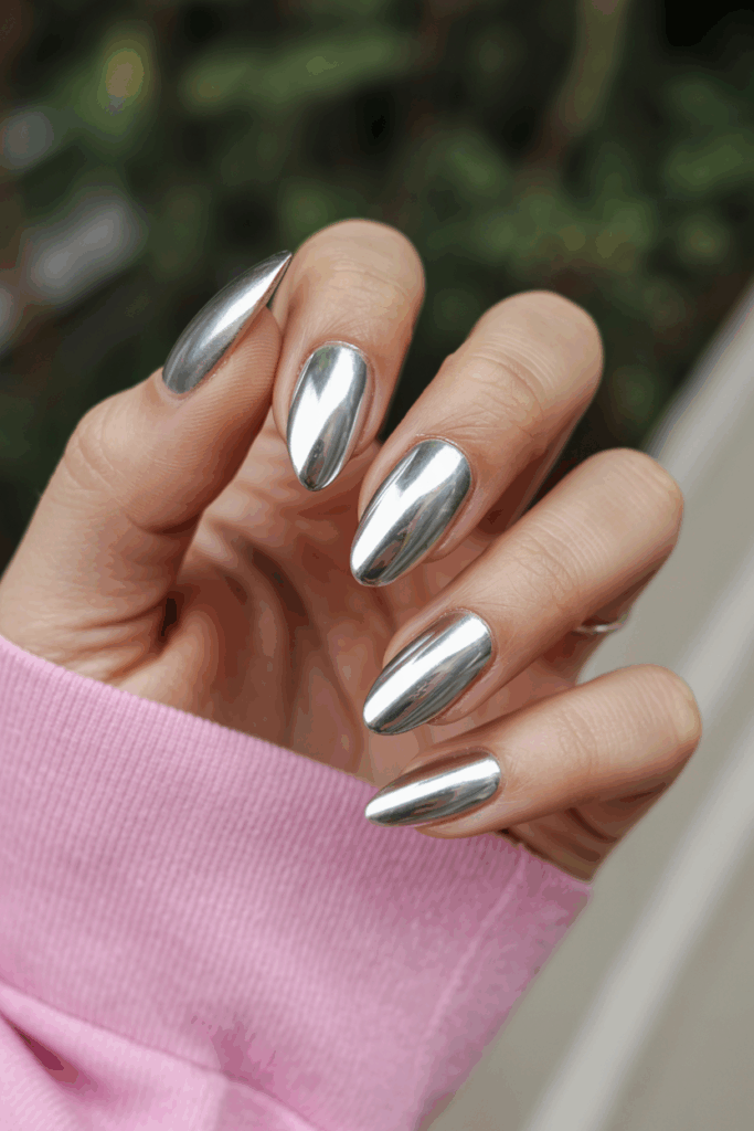 Chrome silver shine gives short almond nails a sleek, modern look. The reflective surface adds a subtle shine without overwhelming the natural shape.