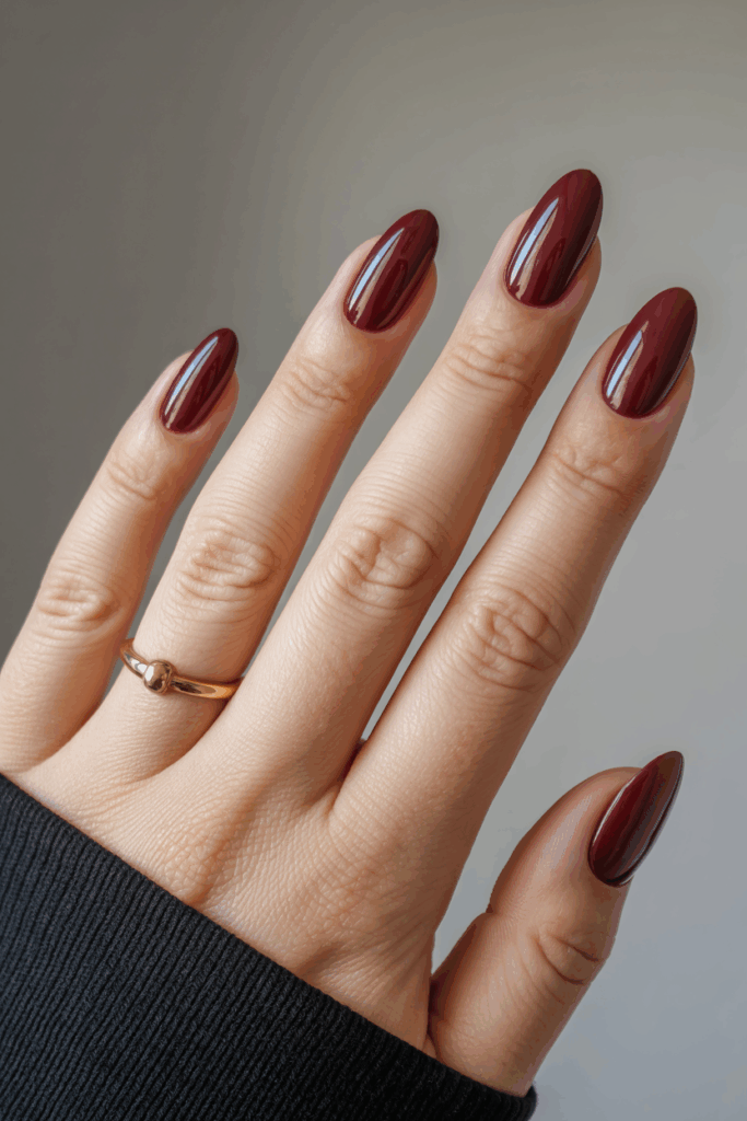 The almond shape softens the intensity of red, making it elegant rather than overwhelming. It works well with classic cherry reds and deeper, richer shades like burgundy.