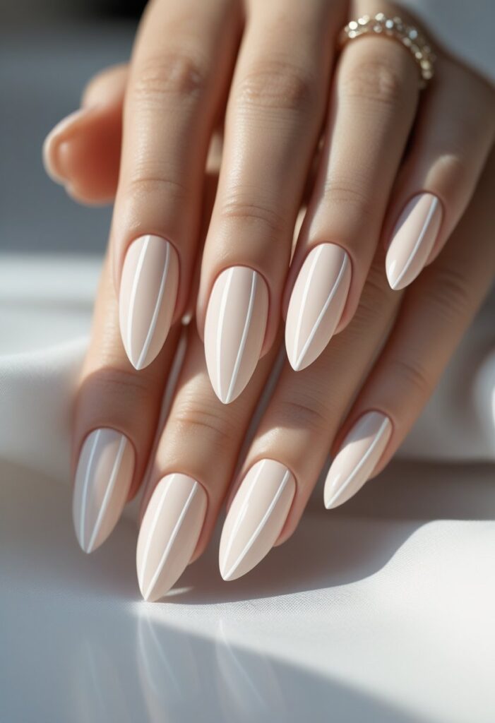 Minimalist white lines fit effortlessly into everyday wear or more formal occasions. They elevate short almond nails by emphasizing shape through understated detail.