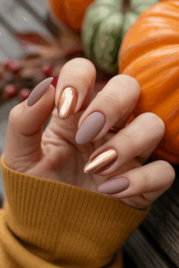 This look pairs a soft, matte nude base with delicate gold foil accents. The gold foil adds subtle shine without overpowering the simplicity of the matte finish.