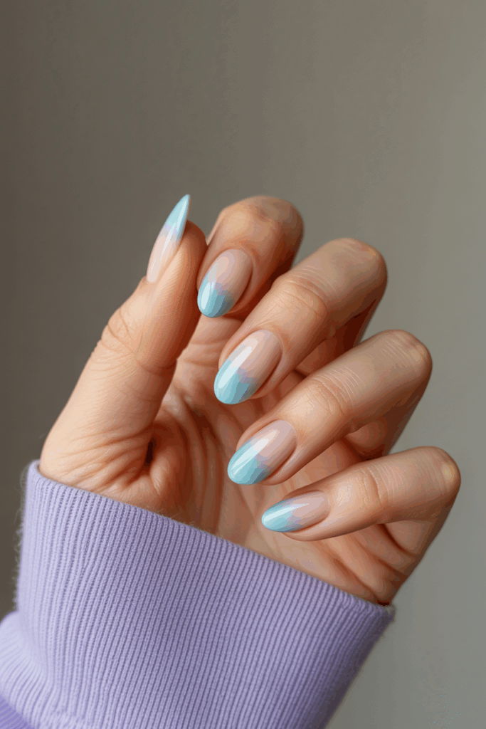 Soft pastel ombre nails blend two or more gentle shades to create a smooth gradient effect. This design uses colors like light pink, lavender, or baby blue, which offer a subtle, elegant look.