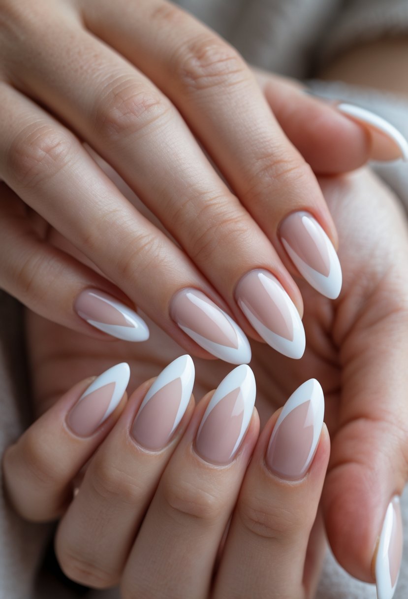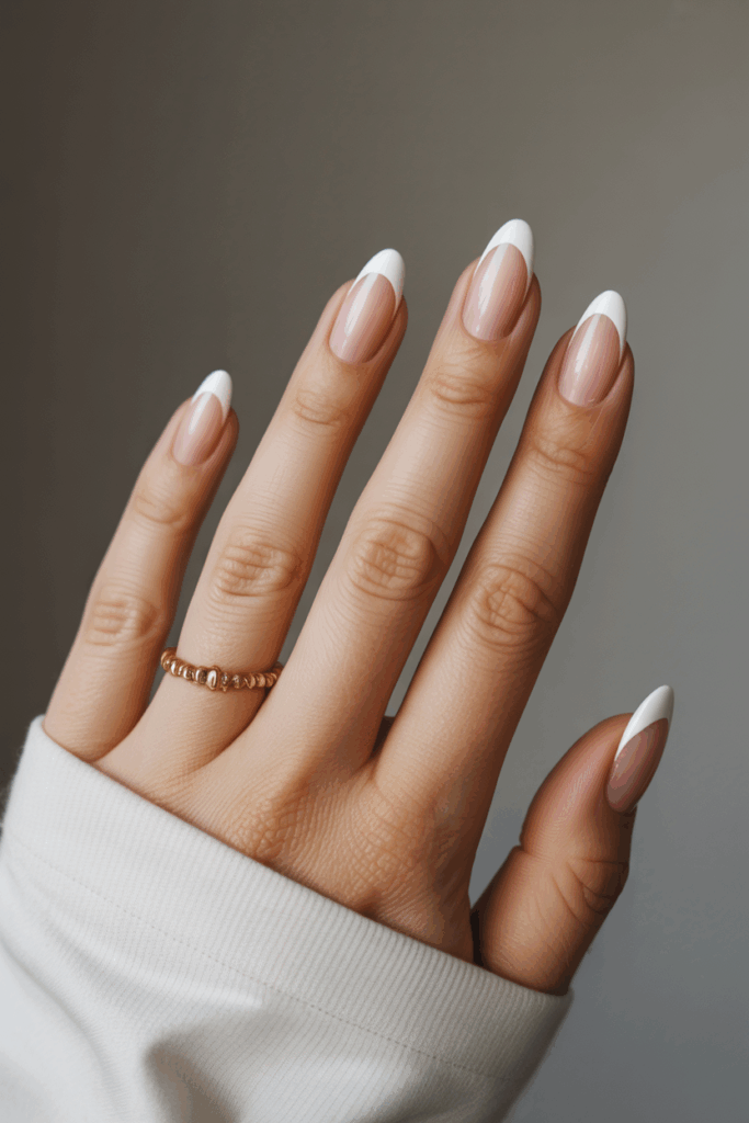 French tips with white accents give short almond nails a clean, classic look. The sharp white tips contrast nicely with natural nail colors. This style is simple but adds elegance to any outfit or occasion. It works well for those who want a low-key yet polished manicure.
