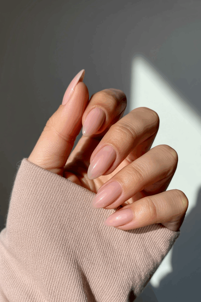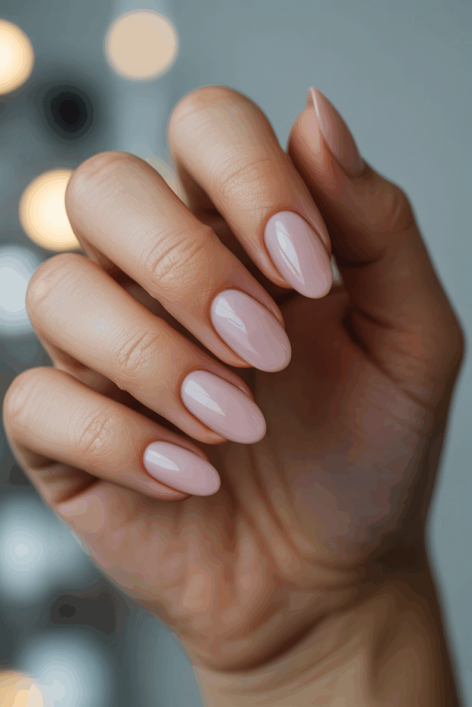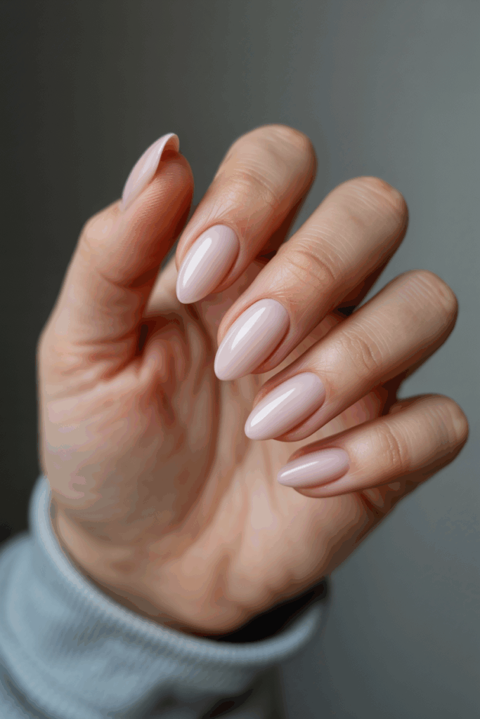 This style features short almond nails with a soft, neutral baby pink shade. The glossy finish gives a clean and polished look. It suits many skin tones and fits both casual and formal occasions.