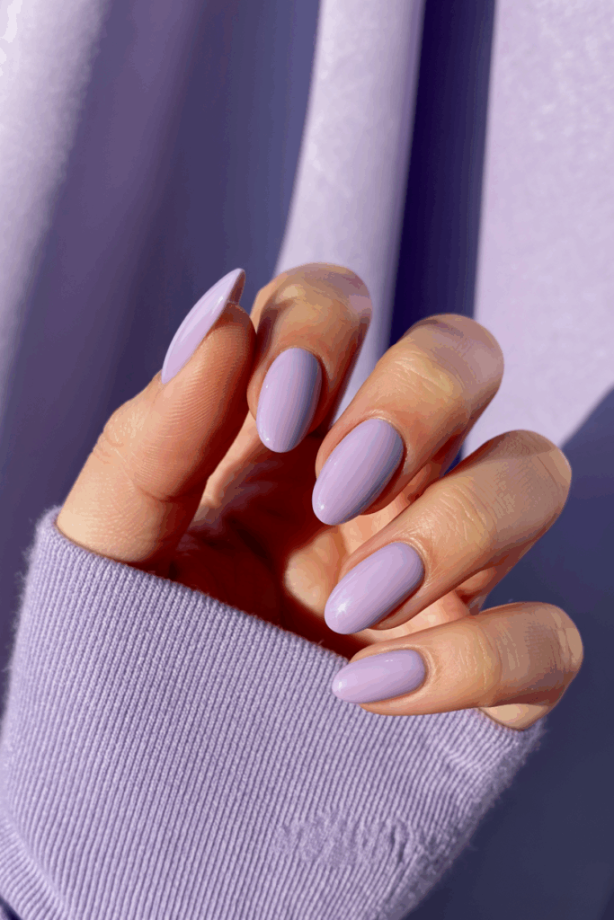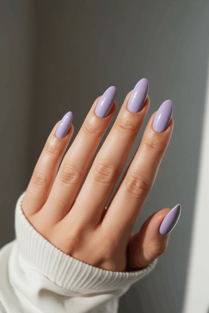 Soft pastel lavender gives short almond nails a calm and gentle look. It works well for everyday wear and special occasions.