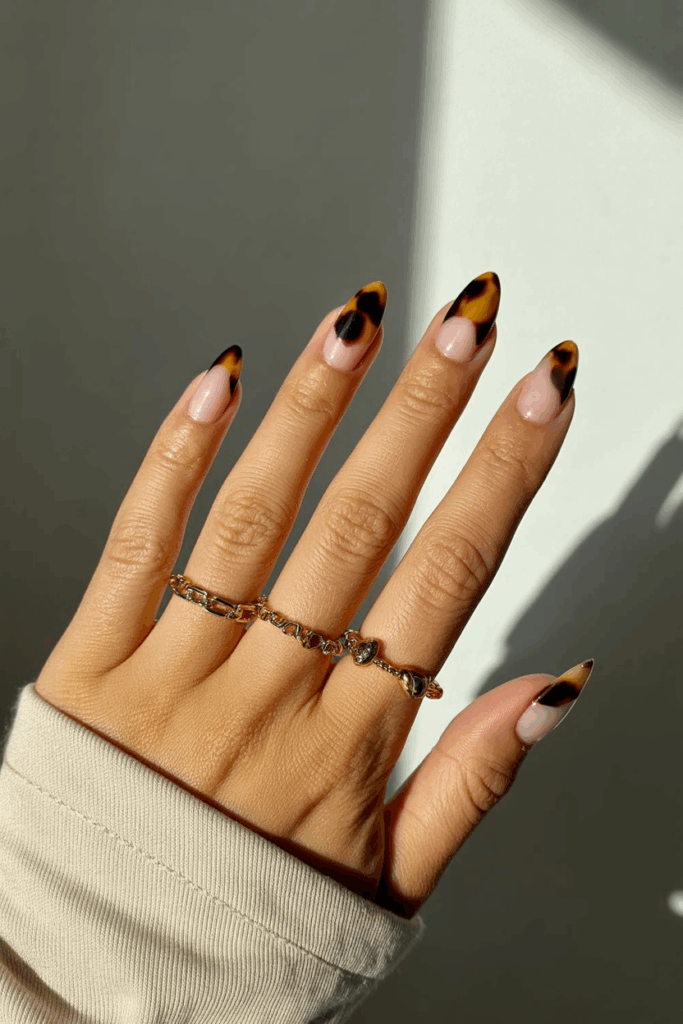 Tortoiseshell print is a popular choice for short almond nails. It offers a polished and sophisticated look that suits many styles. This pattern blends warm brown and amber tones with black accents, creating a classic, natural appearance.