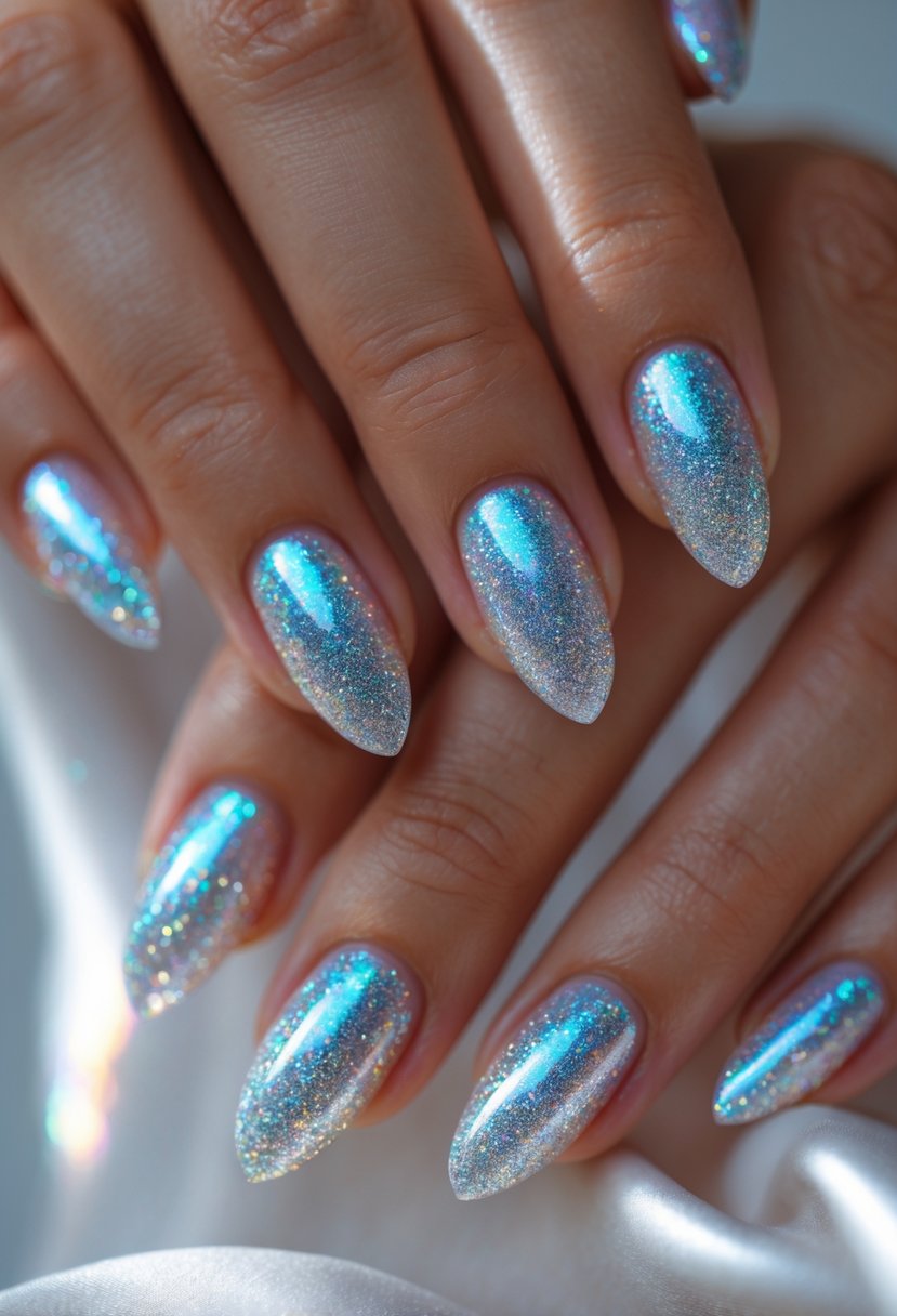 This style combines holographic effects with glitter accents for a subtle shine. The short almond shape enhances the light reflection, creating a polished look without being overpowering.
