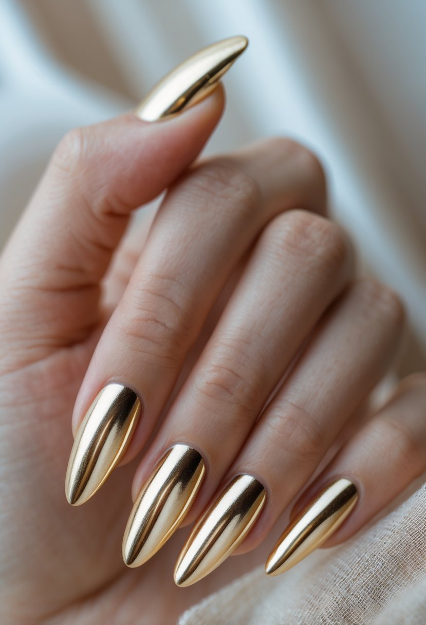 Metallic gold tips on short almond nails offer a sleek and sophisticated look. The pointed French tips in a shiny gold finish contrast well with a semi-transparent or nude base. This combination creates a subtle yet striking effect suitable for various occasions.
