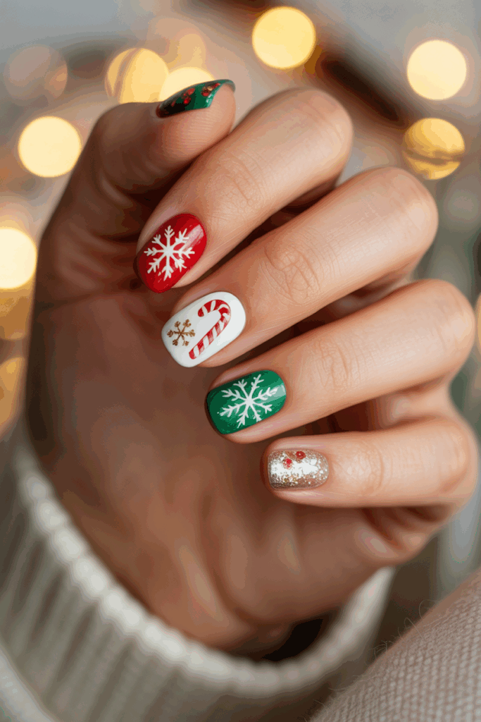 This style suits people who want simple but stylish Christmas nails. It balances classic colors with a bit of sparkle for the season.