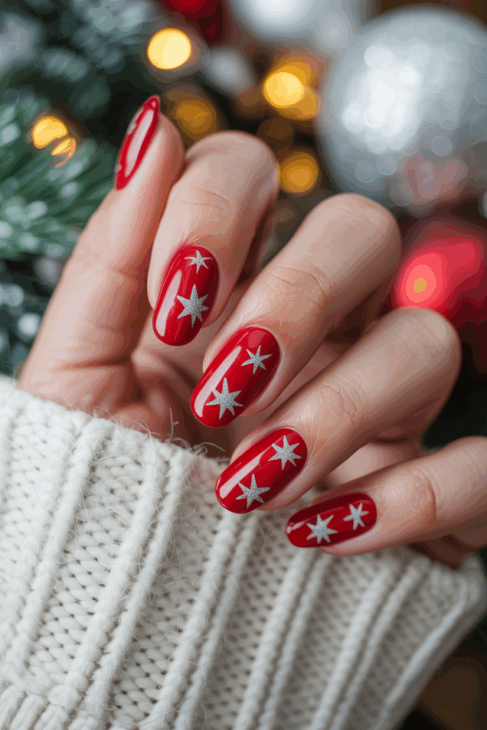 It suits anyone who wants a classic holiday look with a little sparkle. The silver stars catch the light without overwhelming the nail.