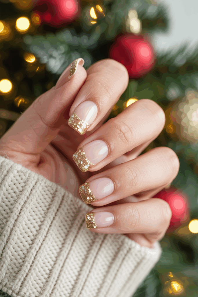 Gold glitter tips add a festive touch to short nails without being over the top. They create a simple yet elegant look perfect for the holiday season.