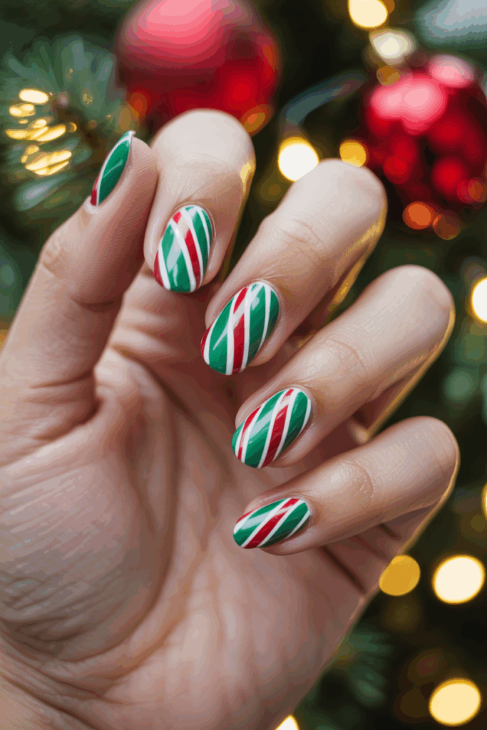 This design uses classic red and green stripes to create a festive candy cane look. The stripes are bold and clear, making the nails stand out without being too busy.
