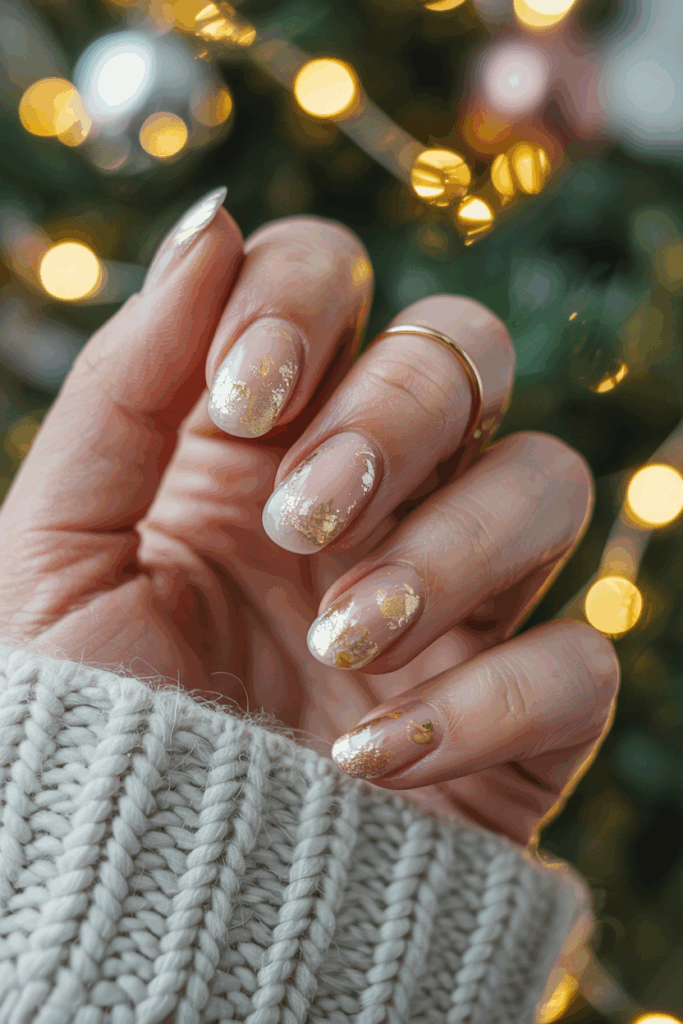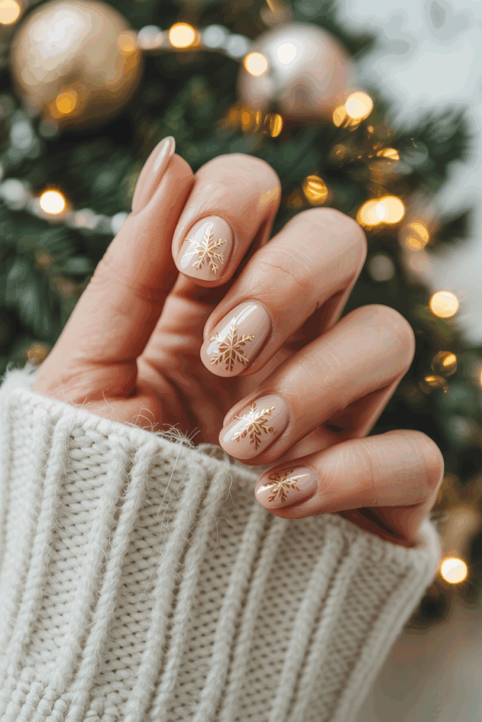 19) Short Nude Nails with Gold Snowflakes
