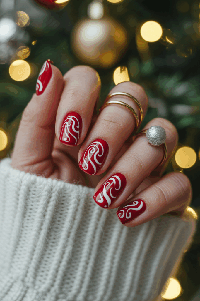 It works well on short nails, giving a stylish yet simple holiday look. The white swirl pattern can resemble candy canes or snow, fitting the Christmas theme clearly.