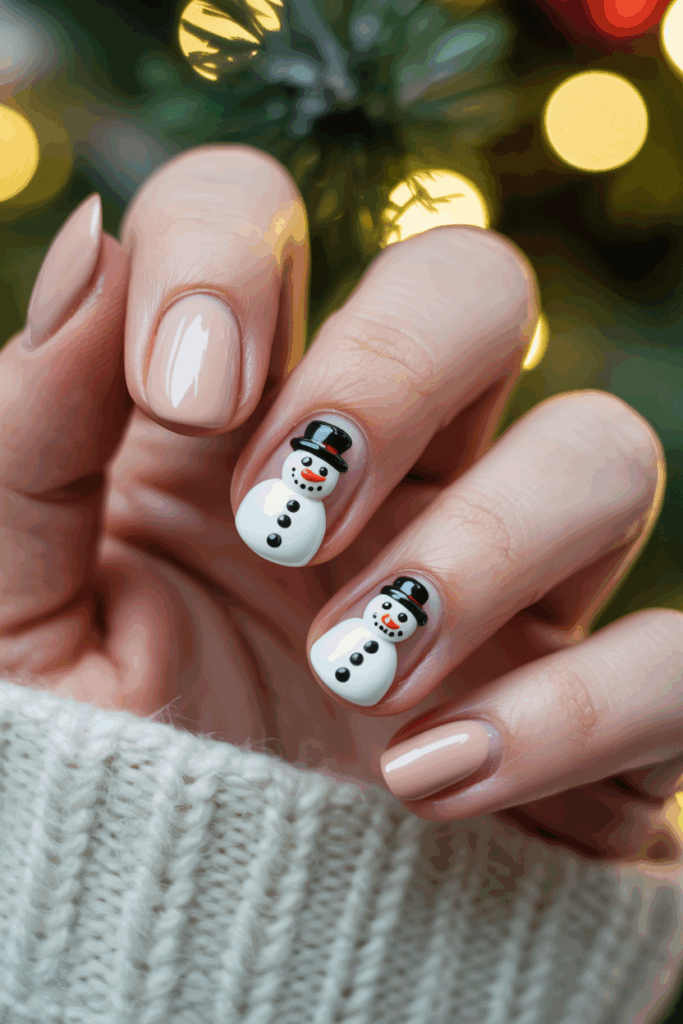 This design features a simple, nude base that highlights a small snowman accent on one or two nails. The nude color keeps the look clean and versatile.