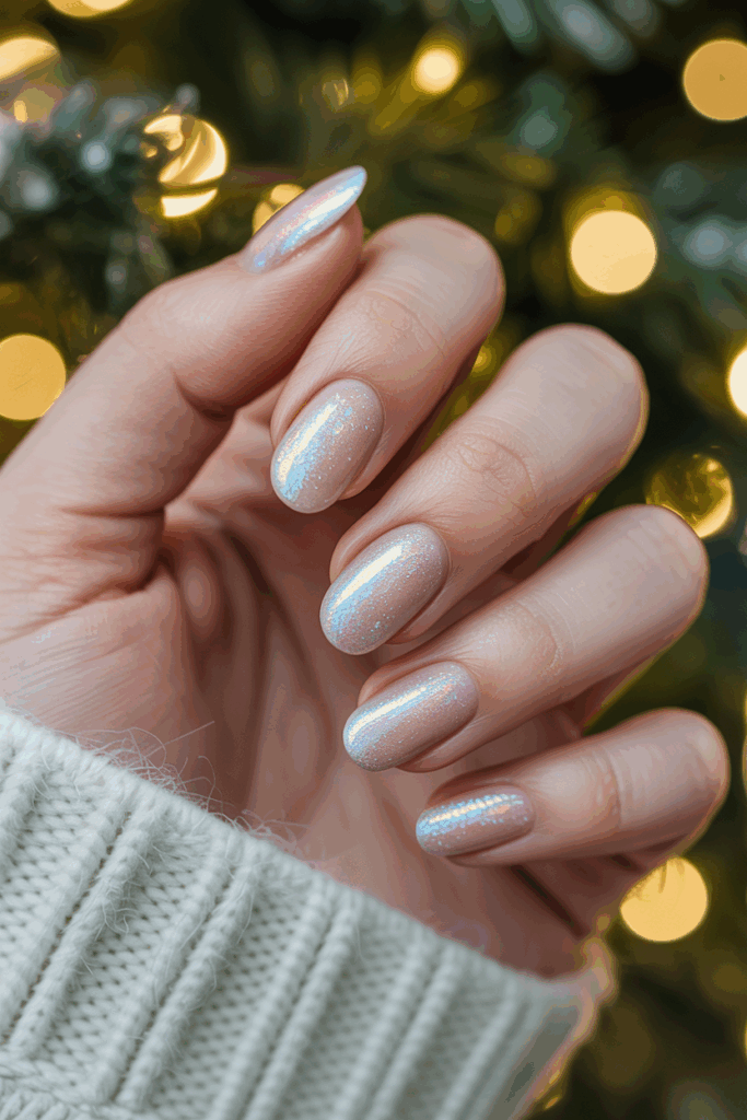 This design adds a hint of shine with delicate holographic frost tips. The effect catches light without being too flashy.
