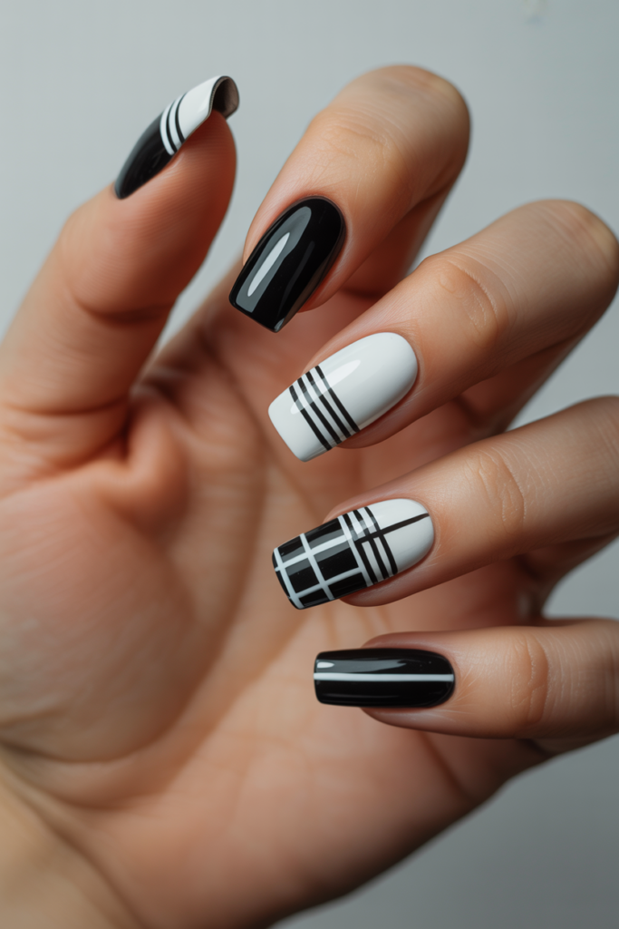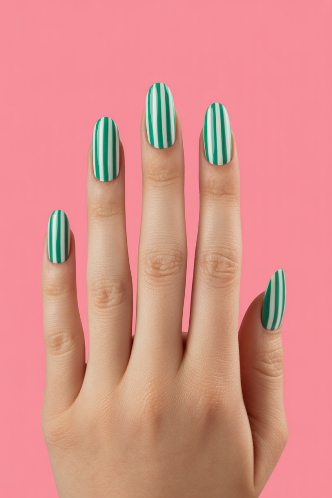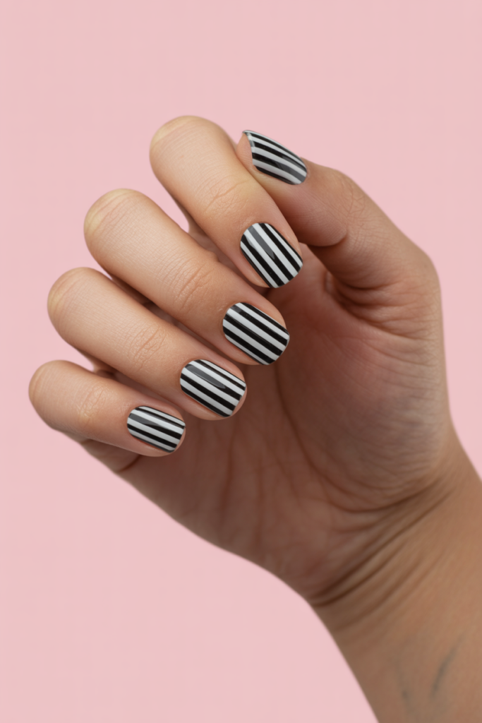 Bold vertical stripes create a striking and modern look on nails. They elongate the fingers and add a clean, graphic touch to any manicure.