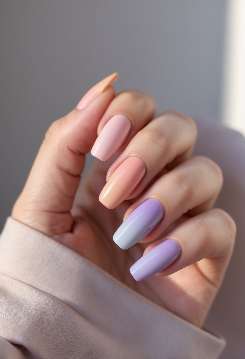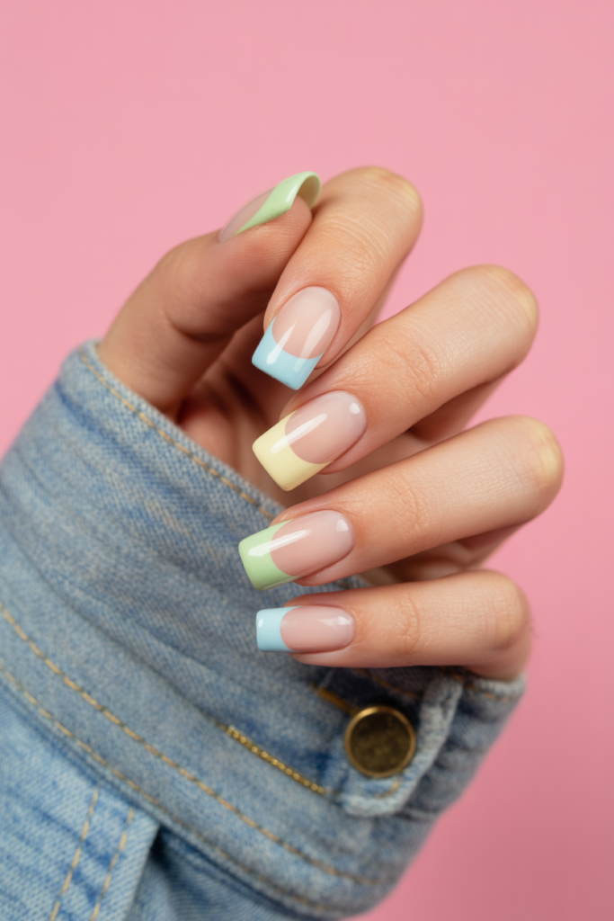 Pastel color French tips offer a soft, modern take on classic French manicures. They use muted shades like baby pink, lavender, or baby blue instead of the usual white tips. This style is subtle and works well for any season or occasion.