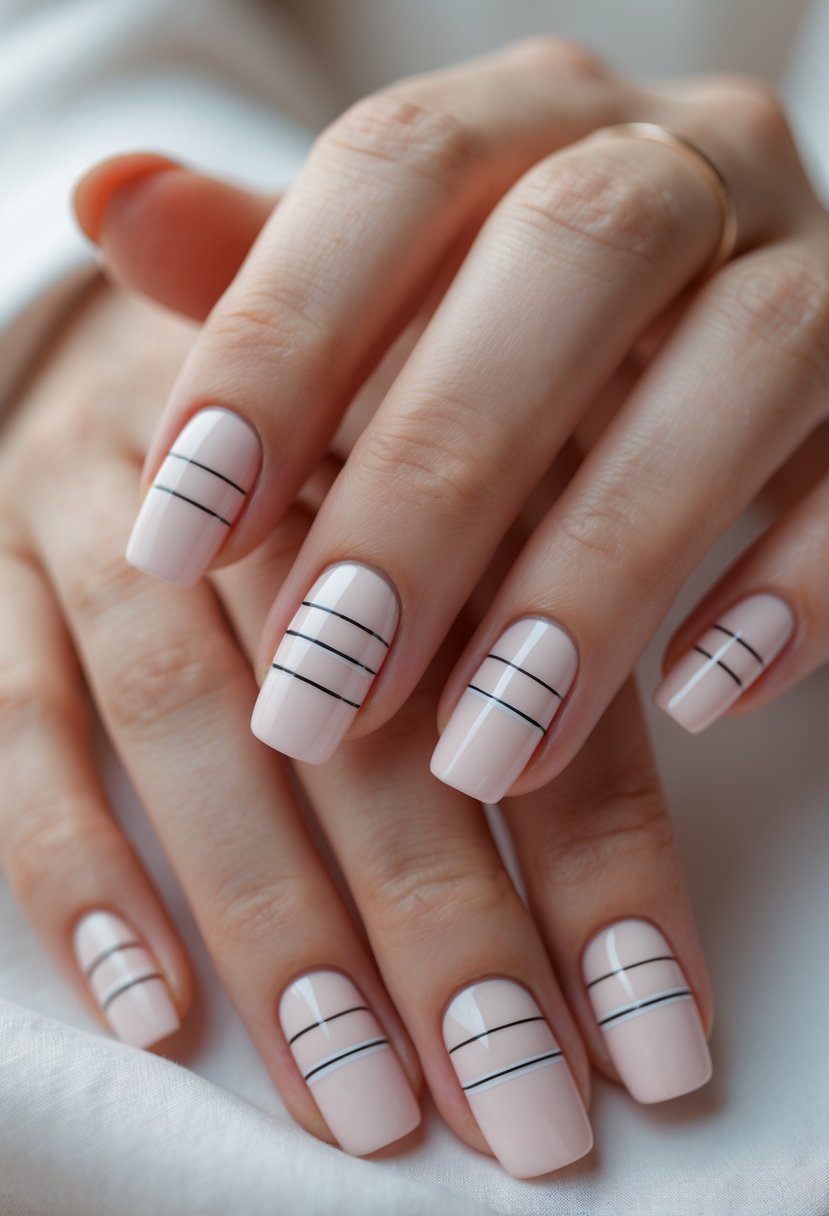 Thin horizontal stripes create a neat, modern look on nails. They suit both short and long nails and work well with bold or neutral colors. This design is easy to achieve using striping tape or a steady hand with a thin brush.