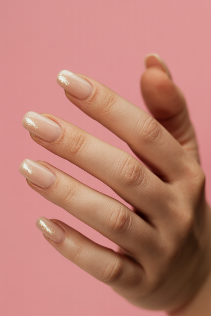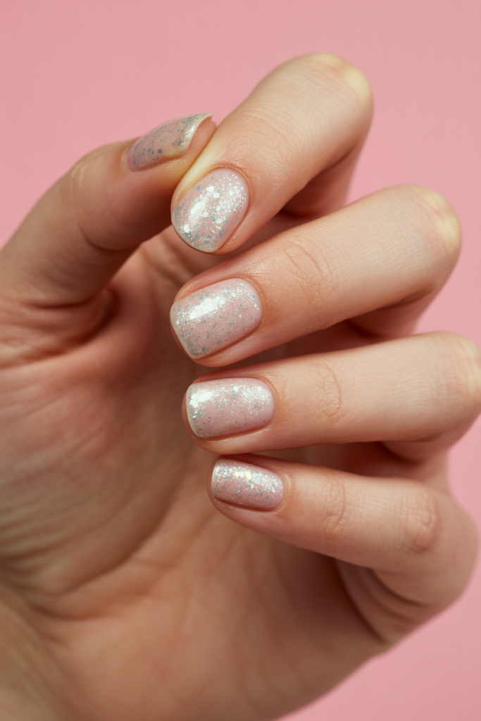 A clear or neutral base with a subtle glitter topcoat adds the tiniest bit of sparkle.