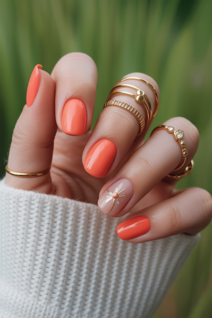 Soft coral nails bring warmth and brightness without being overpowering. This shade sits perfectly between pink and orange, making it flattering and lively.