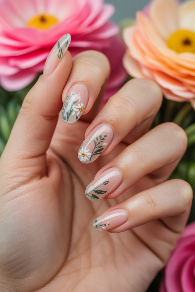 Daisy nails feel like spring bottled into a manicure. The simple flower shape instantly brings warmth and happiness, even when the rest of the design stays minimal. A single daisy accent nail can be just as impactful as a full floral set.