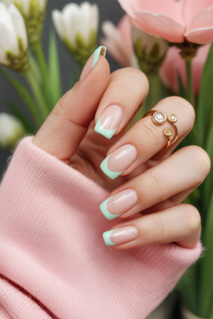 This style is ideal if you like subtle color but are not ready for a full pastel manicure. Light lilac, baby blue, soft peach, or pale green tips keep things playful while still feeling refined. The neutral base helps balance everything out.