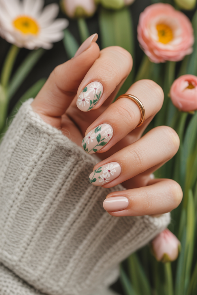 Daisy accent nails are perfect if you want something seasonal without committing to heavy nail art. They feel joyful, approachable, and easy to love.