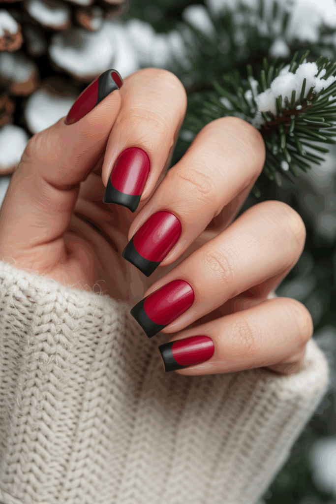 This design combines deep red polish with white snowflake details. It creates a timeless look perfect for winter.